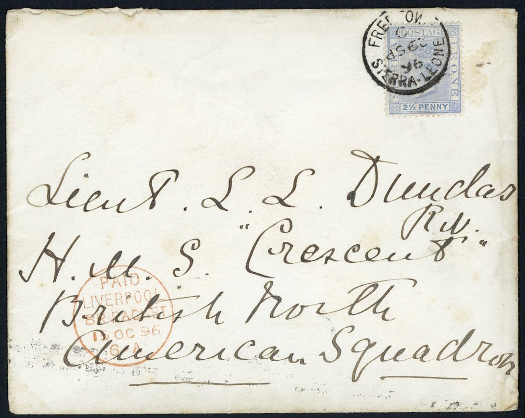 1896 (29 Sept.) envelope from Cdr. Dundas in Sierra Leone to his son "Lieut L.L. Dundas, H.M.S. Crescent, British North America Squadron", bearing 1891 2½d. tied by Freetown c.d.s. and showing "paid/liverpool/br. packet" c.d.s. (16.10) in opposite corner