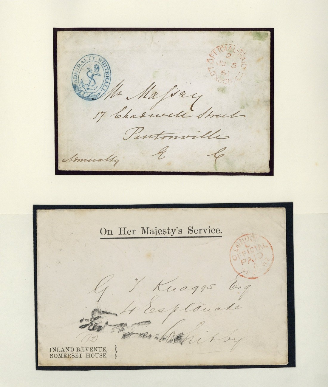 1776-1892 collection of 184 pre-stamp or stampless entires or entire letters, housed in two albums, contained in a carton, including 1794 with straight line "carnarvon", 1803 with "ferrybridge/174", 1812 with framed "couperfife" d.s., 1824 from Colombo with red framed "india letter/portsmouth", 1827 Returned paid Letter wrapper, 1827(2) with "easdale/penny post", 1839 with red Drummond St/2d. Paid, 1836 with "taunton/30 ju 1836/py post", 1861 with red "official paid" d.s. and blue Admiralty/Whitehall cachet, 1892 with red "official paid" d.s. and blue Science and Art/Department cachet, etc., strikes and condition mixed