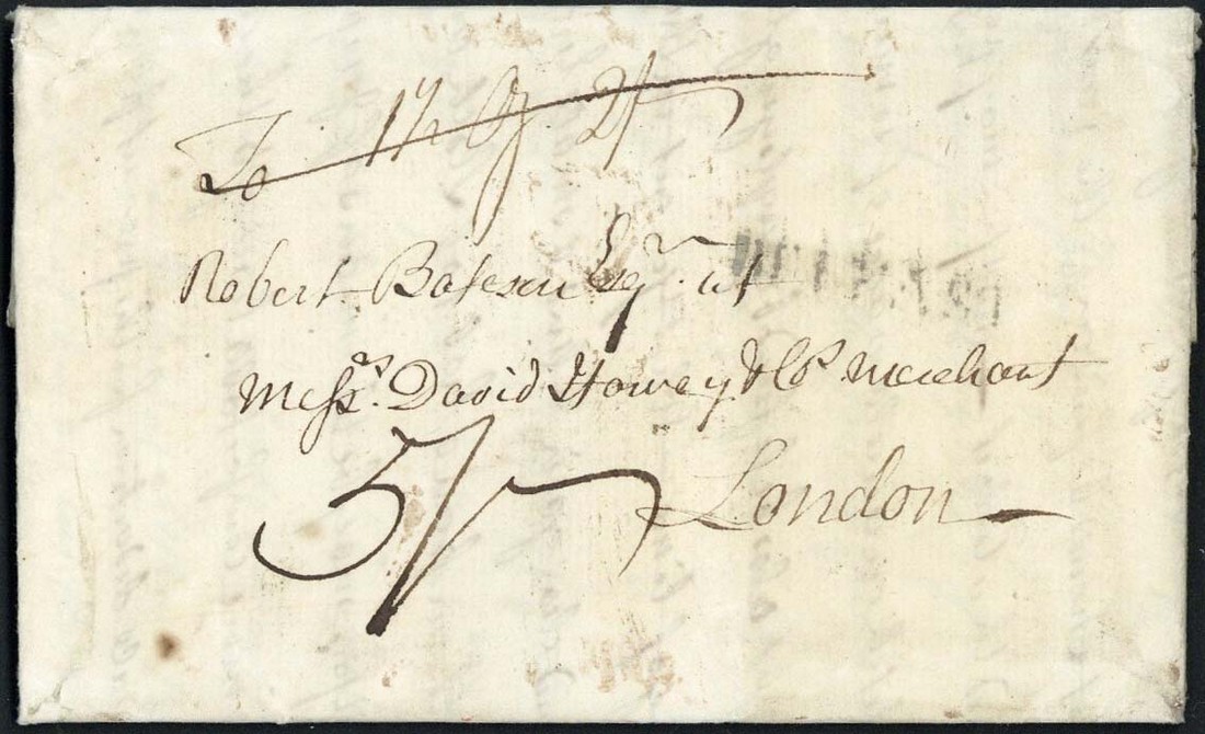 1777 (28 April) entire to London, endorsed "To 1½oz. 2/-" deleted and replaced by "5/-", black "belfast" handstamp, on reverse despatch and arrival Bishop marks; fine and early usage from Belfast