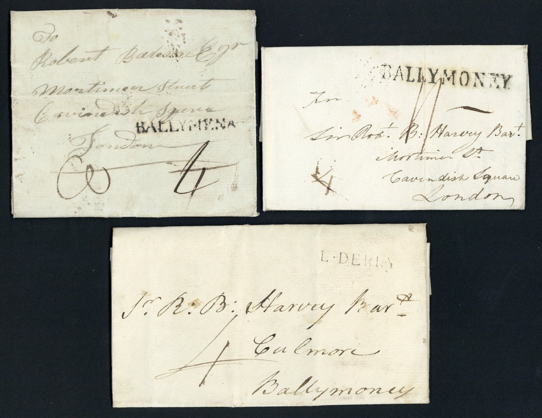 1788 (8 Aug.) entire letter to London with "ballymena", 1792 (19 Oct.) entire letter to Ballymoney with "l.derry", 1797 (30 Jan.) entire to London with large "ballymoney"; filing folds but an impressive early trio in fine condition