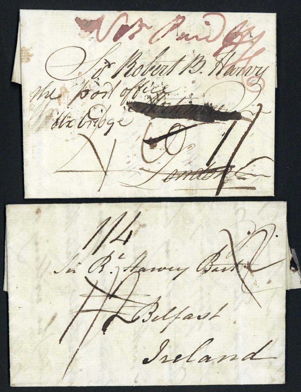 1790 entire letter from Derry to London, redirected to Uxbridge, endorsed "Not Paid" in red and with a variety of rate markings; 1792 entire letter to Belfast with on reverse two serpentine "uxbridge" handstamps; a fine pair