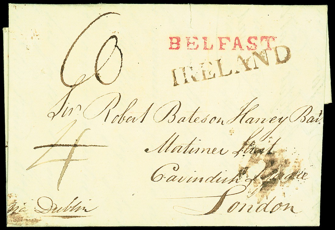 1790 (1 May) entire letter Via Dublin to Cavendish Square with black "ireland" and red "belfast", both superb strikes, rated "4" (deleted) and "10" in manuscript, arrival datestamp (4.5) on reverse; light filing fold through the handstamps and small tear at the top, fine. A spectacular Irish rarity. Photo