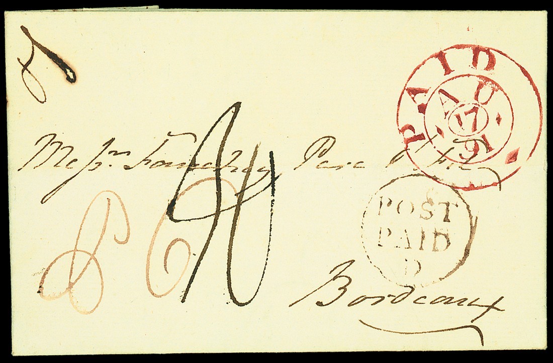 1791 (13 Aug.) entire letter from Dublin to Bordeaux with black "post/paid/d" in circle and red London experimental double ring "paid/au/17/91" (1/29), slightly unclear Bishop mark datestamp on reverse, very slight ink burning on the address panel, fine and scarce. Photo