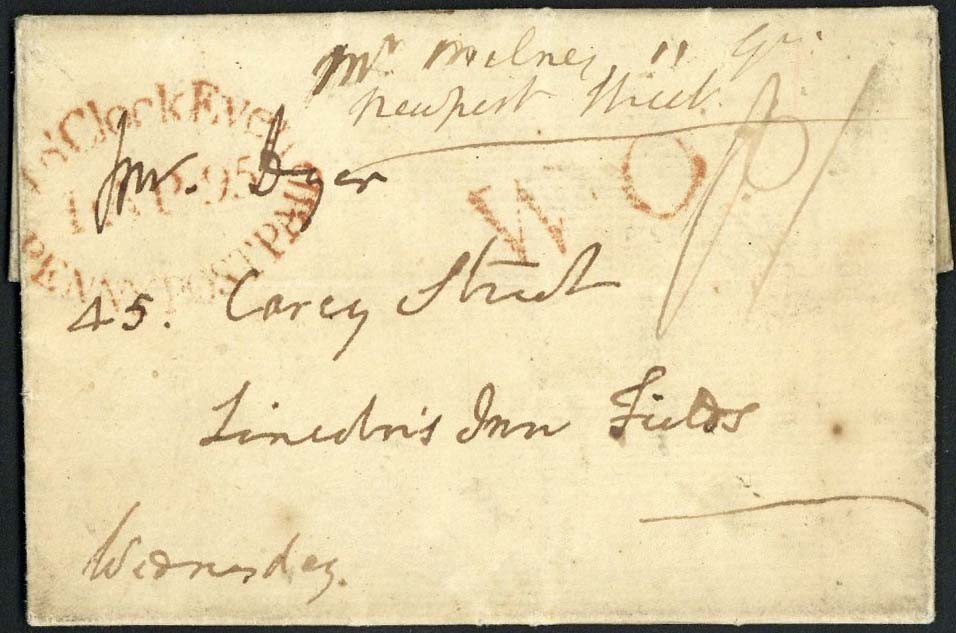 1795 (1 April) entire letter to Lincolns Inn Fields with red oval Penny Post Paid datestamp and "W.O" (Westminster Office) in the same colour alongside; a trifle soiled but rare