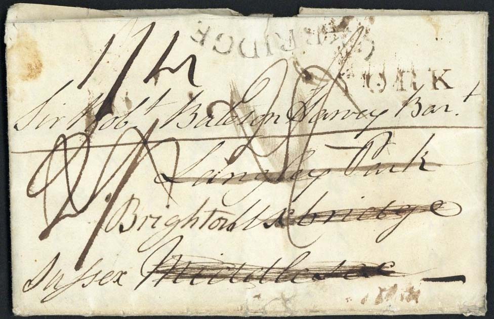 1799 (1 May) entire letter from York to Middlesex, redirected to Brighton, with "york" (unrecorded size) and very scarce serpentine "uxbridge" on the front, a variety of rate markings, datestamps on reverse; fine