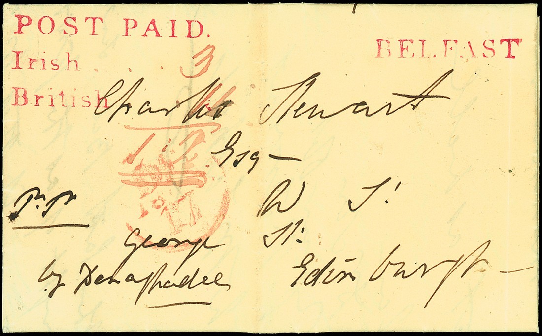 1805 (13 Dec.) entire letter to Edinburgh with red "belfast" and a superb strike of the rare "POST PAID/Irish/British" (Willcocks E1587) in the same colour, completed by hand with 3d. Irish and 11d. British; unobtrusive vertical filing fold well clear of both handstamps, An outstanding and an important exhibition item. Photo