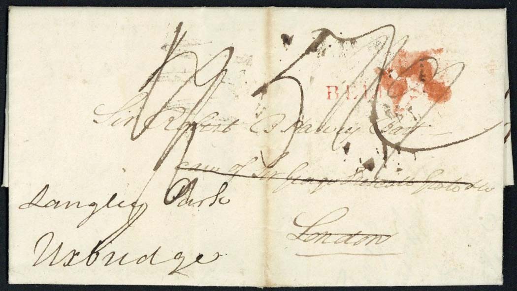 1812 (17 Nov.) entire letter to London, redirected to Uxbridge with red "belfast" on the front, on reverse fair Dublin "Mermaid" datestamp (across flap) and red "s" (Sunday) arrival d.s. (22.11); vertical filing fold clear of the handstamps, fine