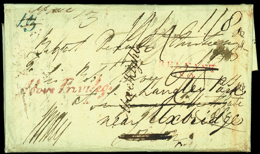 1815 (18 Dec.) entire letter, with two enclosures, from Belfast to London, redirected to Uxbridge, endorsed "1oz", deleted and replaced by "Above 1oz.", with red "belfast/80" mileage and "Above Privilege" handstamps in red, "Above Weight" handstamp in black, a variety of manuscript rate markings; some minor cover faults due to the enclosures, but a unique and important rarity. The "Above Privilege" marking only recorded in 1801, and the "Above Weight" not previously recorded in black, and both handstamps very rare on cover. Photo