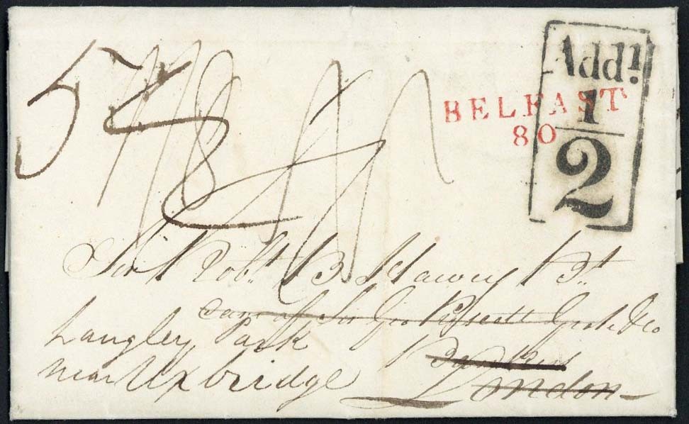 1816 (6 April) entire letter to London, redirected to Uxbridge with superb red "belfast/80" mileage mark overstruck by framed "Addl./½", a variety of rate markings on the front and datestamps on reverse; light vertical filing fold clear of the handstamps, fine