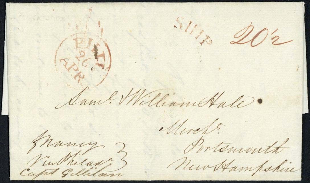 1817 (10 Feb.) entire letter from Cork to New Hampshire, endorsed Nancy/Via Phila/Capt. Gillilan, rated 20½, red "ship" and "phil/26/apr" transit datestamp on the front, on reverse Cove 22 feby 1817/Received and forwarded by/Your obed Servt/James Fitzpatrick; interesting contents relating to the sale of flax seeds and converting £1,000 British to £1,100 Irish. A fine transatlantic letter and a fascinating piece of Irish postal history