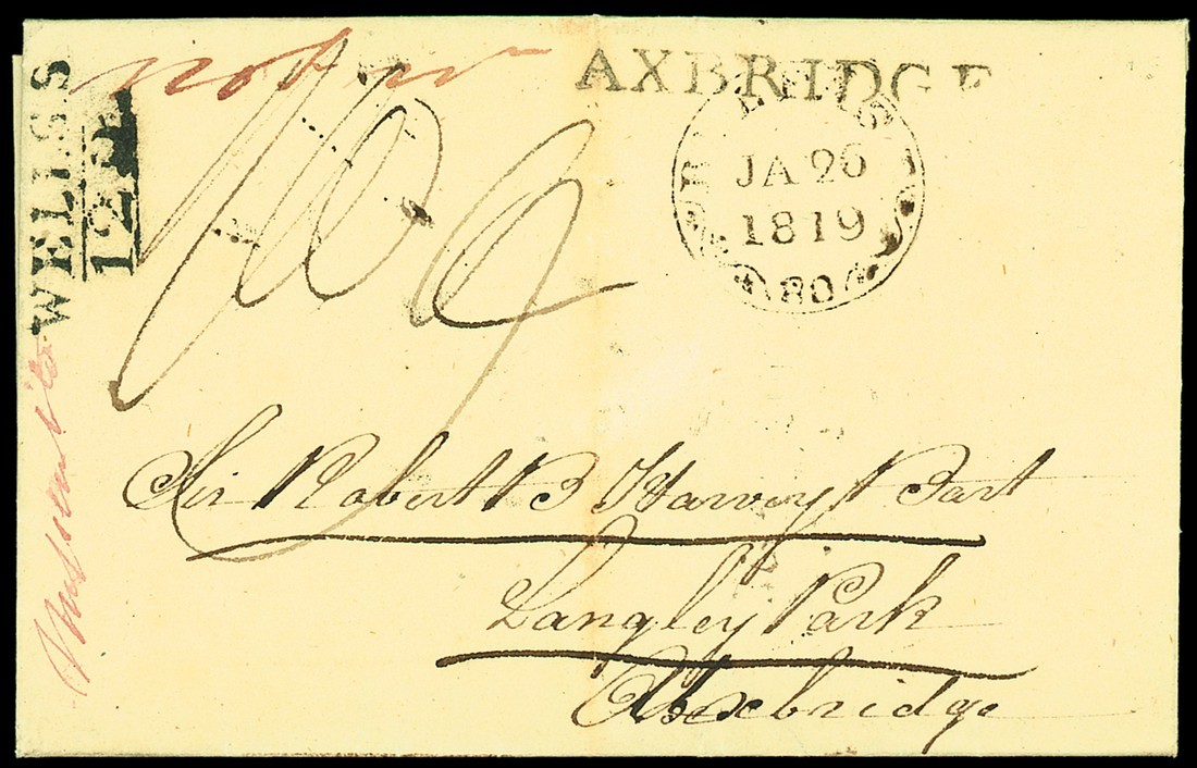 1819 (26 Jan.) entire letter to Uxbridge with "belfast/80" decorated mileage c.d.s., Not in "axbridge" and Missent to "wells.s/120" on the front, dated markings on reverse; light vertical filing fold just affecting the "axbridge" handstamp, fine. Photo