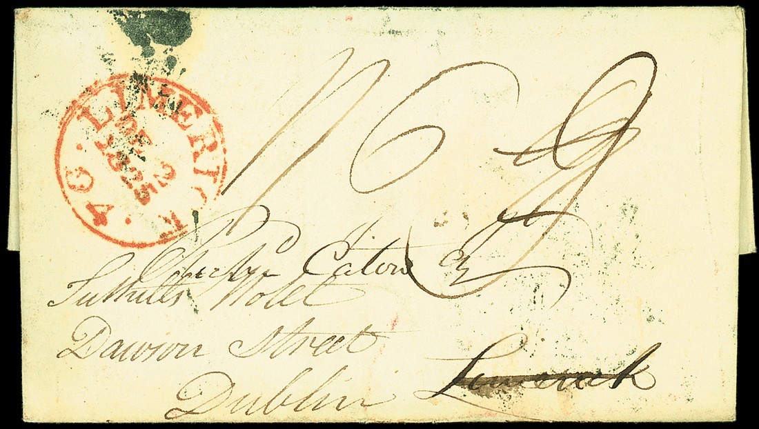 1825 (1 Dec.) entire letter to Limerick, with red Limerick/94 mileage d.s., rated "9", redirected to Dublin, the rate mark deleted and replaced by "1/6", on reverse oval with indents Dublin 2O'clock marking, deleted by "zig-zag" handstamp, replaced by oval 12O'clock marking struck over Dublin octagonal d.s.; fine and scarce. Photo