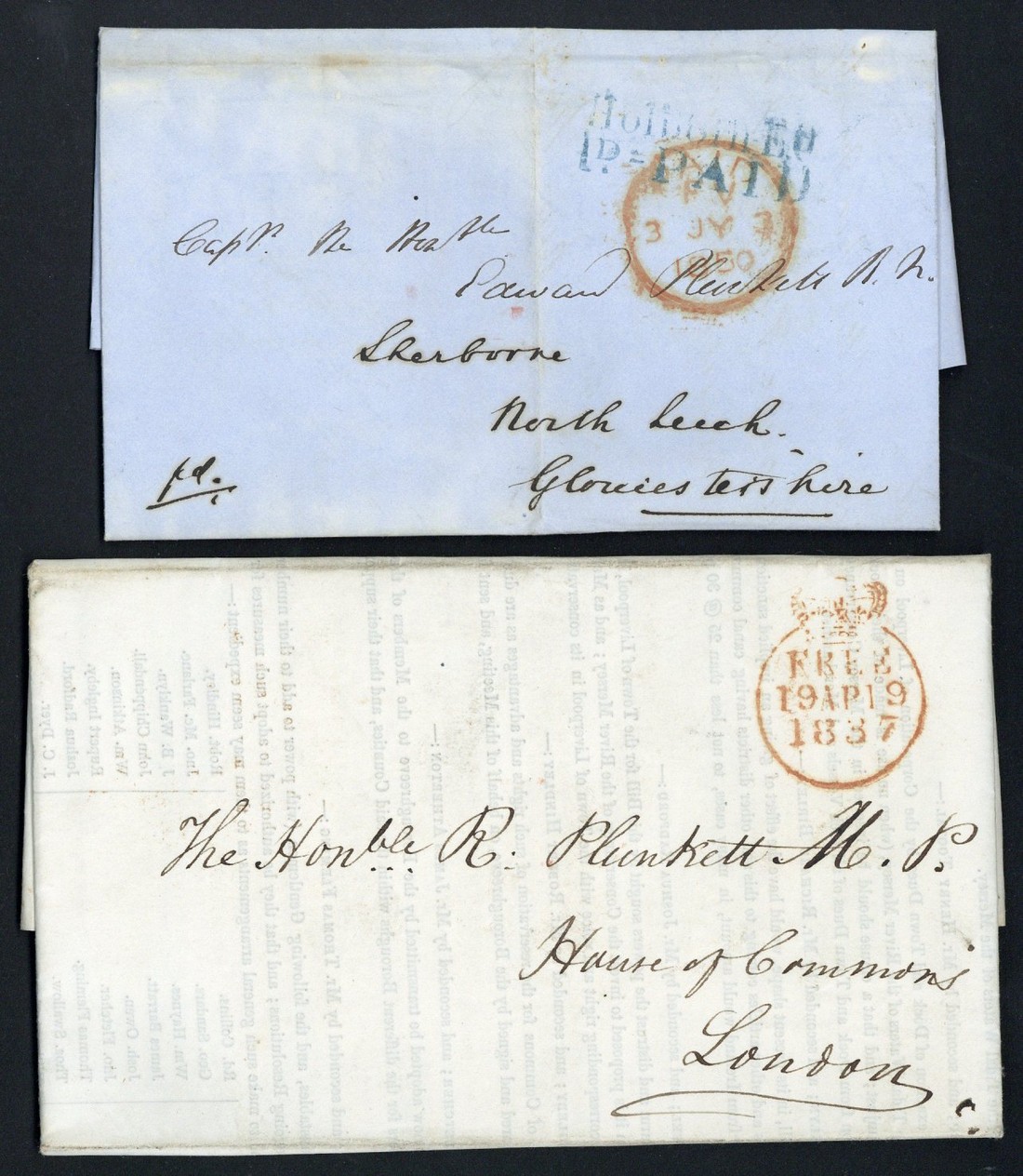 1827-96, selection of fifty six covers or cards, many ex the same correspondence to Ireland, including 1835 with red framed "put in after/six o'clock", 1839 with red framed "paid at /liverpool", receiving houses, paid markings, etc., mixed condition