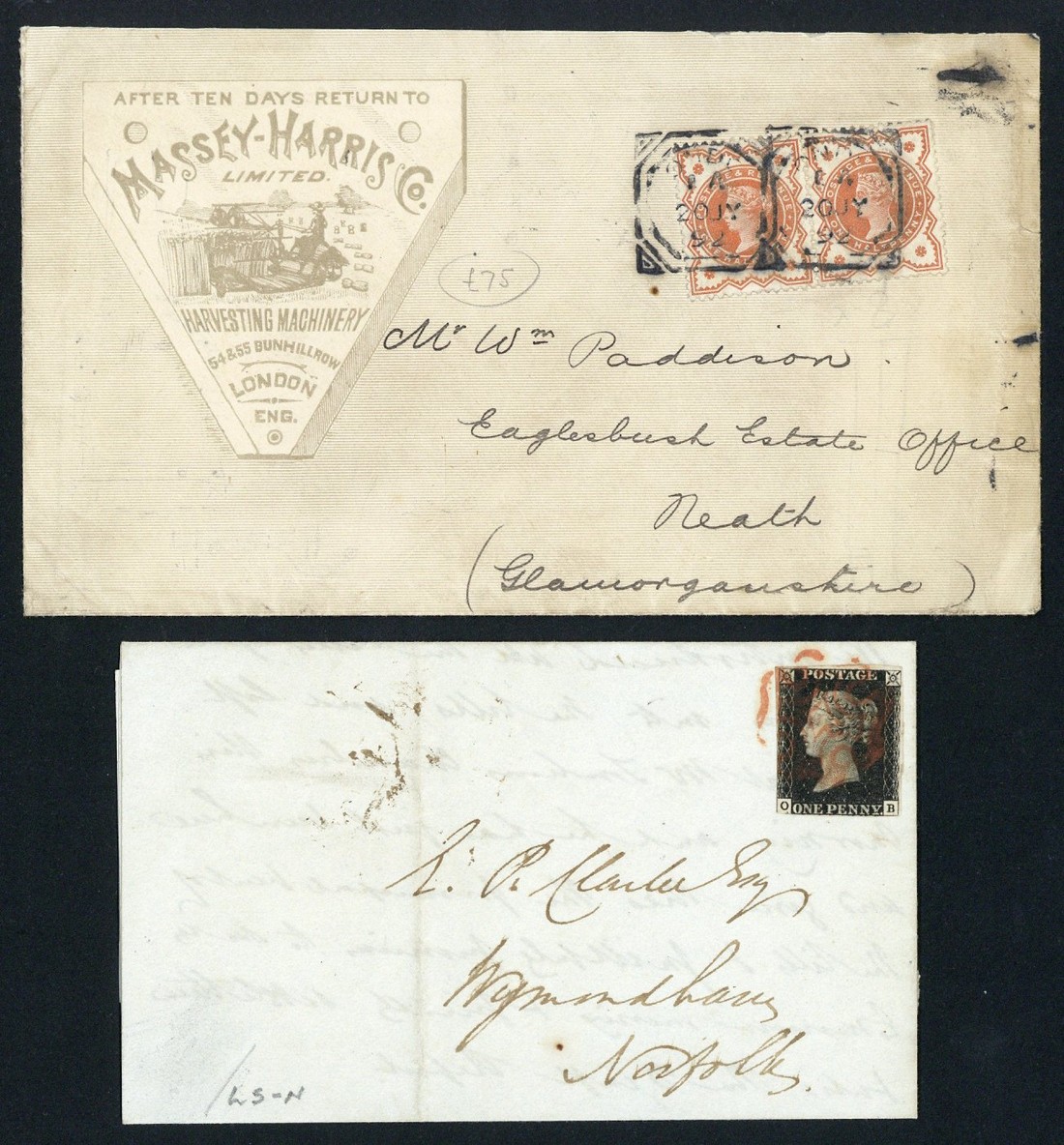 1827-1935 collection housed in two black albums contained in a carton, ninety items, including 1840 1d. black on entires (5), 1841 entire letter to Beverley with red "paid/at/leeds" in oval and "1d", advertising envelopes, Free letters or fronts with signatures of, or addressed to B. Disreali, W. Gladstone, Lloyd George, Palmerston, Robert Peel, etc., chiefly good to fine