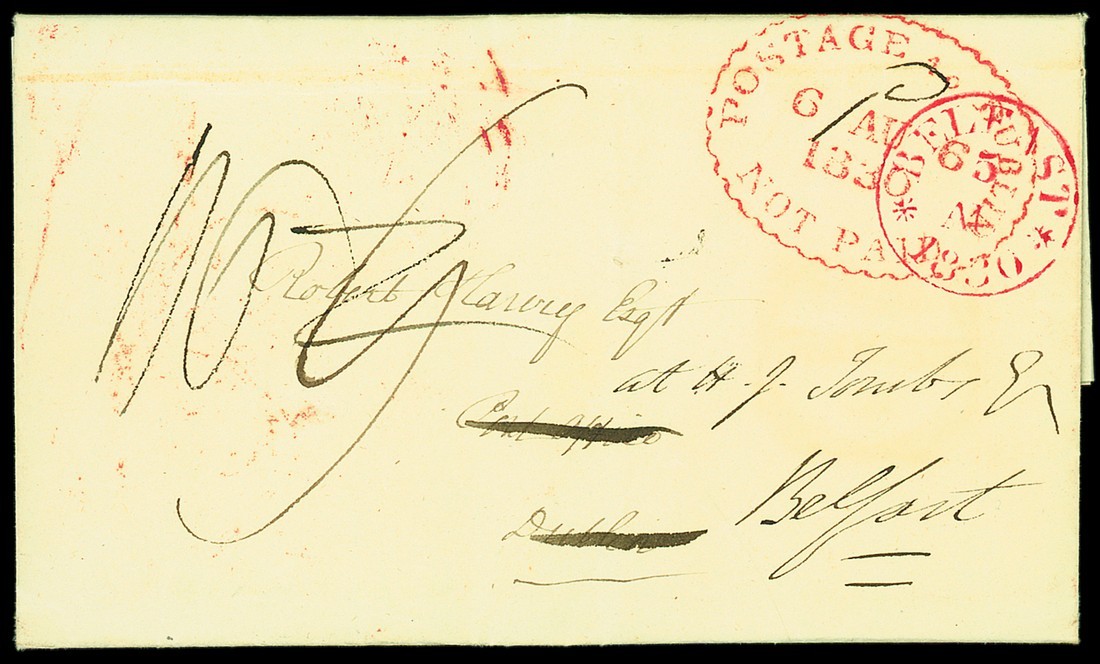 1830 (5 Aug.) entire letter from Belfast to Dublin, redirected to Belfast, with red "*belfast*" c.d.s. overstruck by a very fine strike of the extremely rare scalloped oval "postage to dublin/not paid" (Willcocks ES1685) datestamp of 6 Aug.; a superb exhibition item. Photo,