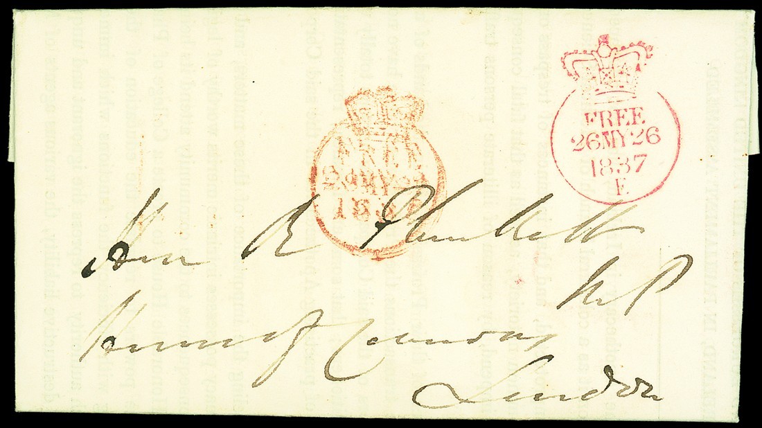 1837 (26 May) printed entire letter from Dublin to the House of Commons in London, with a superb strike in red of the rare Irish "free" single circle with time code "f" (forenoon) at foot (1A/40) and London "free" arrival; very fine. Photo