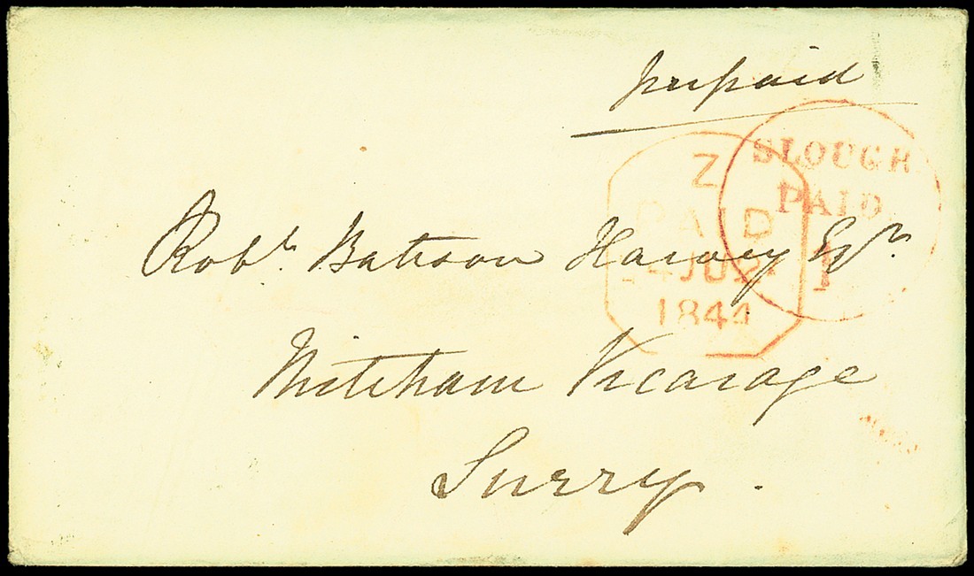 1844 (24 June) envelope, endorsed "prepaid", with long enclosure, addressed to Surrey, with fine red circular "slough/paid/1", overstruck by Tombstone datestamp; small sealed flap tear, fine. Photo