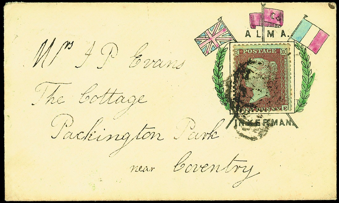 1856 (20 Feb.) hand coloured patriotic envelope, commemorating the Allied victories at Alma and Inkerman, with the flags of Great Britain, Turkey and France, franked perf. 1d. Stars, used from Bedworth to Coventry, datestamps of Bedworth, Nuneaton and Coventry on reverse; fine and scarce. Photo