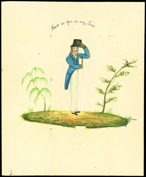 1816 two page letter sheet To be left at the Crown & Thistle, Monmouth and with unclear datestamp, containing a hand coloured "mechanical" gentleman doffing his hat (not working), fine and attractive
