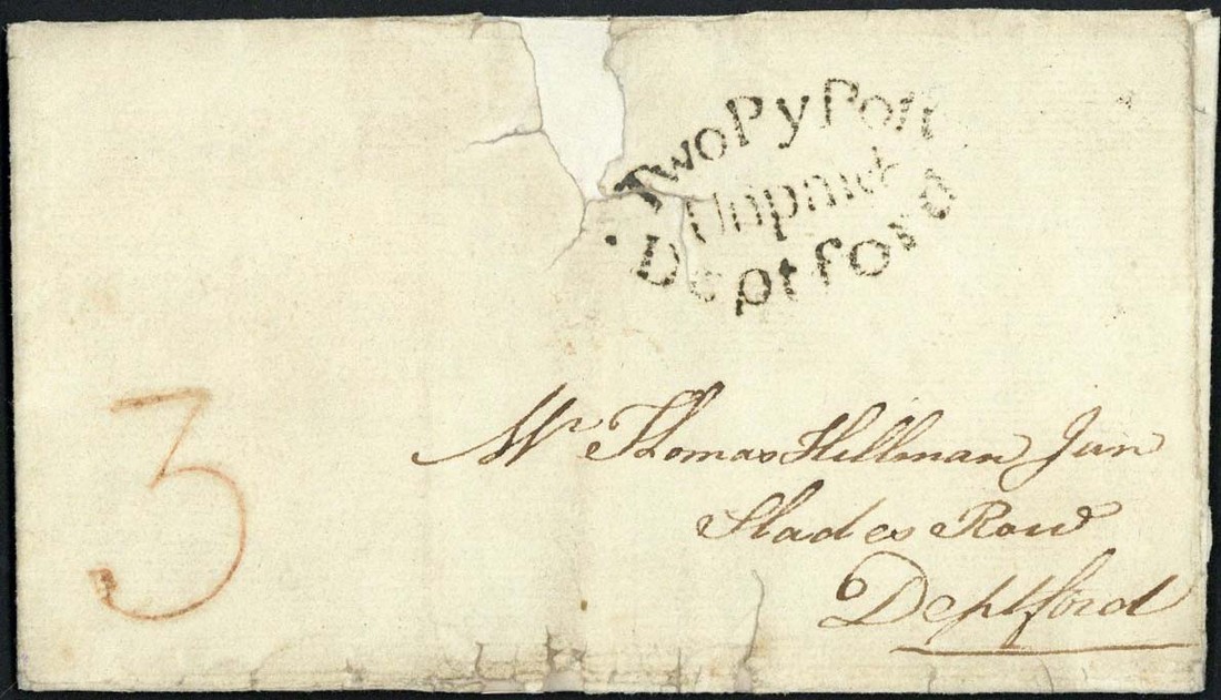 1818 (10 Feb.) entire letter to Deptford with very scarce red flat topped "3" and black "Two Py Poft/Unpaid/Deptford" handstamps; the entire letter with a handwritten Valentine message concluding ".... I would not have troubled you with this Valentine before the day arrived but knowing it was the custom of some people to return them I thought that you might be one of that number". A small portion of the address panel and most of the top flap missing, some strengthened splits and perimeter faults along the folds, nevertheless a scarce early use of a Valentine asking to be reciprocated