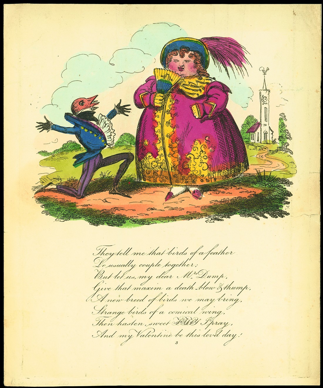 1832 two page entire letter posted within London for local delivery with "3" handstamp on front and red London datestamp of 28 Feb. on reverse, containing a comic lithographed hand coloured Valentine depicting a man on his knees before a lady; necessary folds and a few small perimeter faults, fine. Photo
