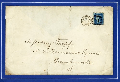 1866 plain envelope franked 2d. with London "74" duplex cancellation of 14 Feb., addressed locally and with accompanying "mechanical" card depicting a young lady in her finery, stared at by a boy and a whiskered gentleman; the envelope with faults and the card a trifle soiled and missing the cotton