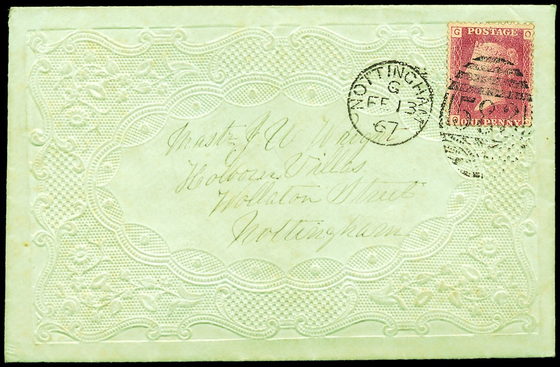 1867 (13 Feb.) embossed paper lace Valentine envelope, decorated on both sides, locally addressed, bearing 1858 1d. Plate 96, tied by "583" duplex cancellation of Nottingham; stunning and rare. Photo