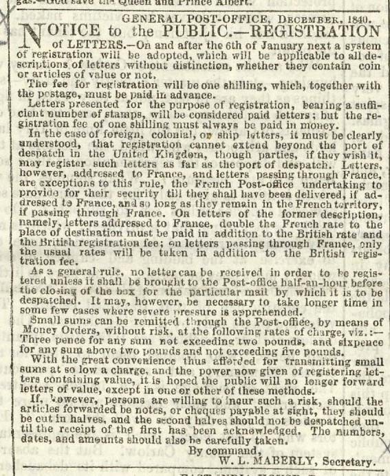"The Morning Chronicle": 10 Dec. 1840, including page 1, column 3 a notice "General Post Office, December 1840, Notice to the Public - Registration of Letters - On and after the 6th. of January next a system of Registration will be adopted...... and giving details, signed W.L. Maberly, red 1d. Newspaper tax handstamp; fine