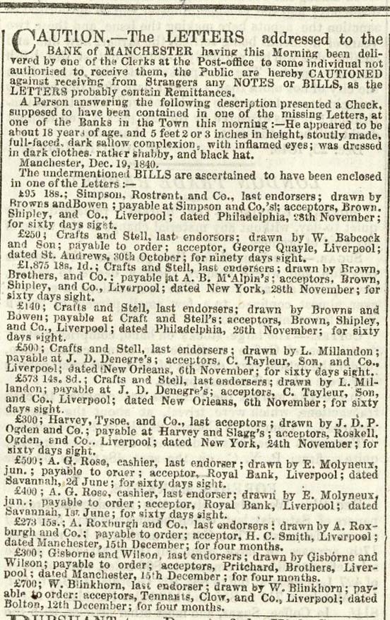 "The Morning Chronicle": 22 Dec. 1840, including Page 1, column 2 "Caution. - The letters addressed to the Bank of Manchester having this morning been delivered by one of the clerks at the Post Office to some individual not authorised to receive them, the Public are hereby cautioned against receiving from strangers any Notes or Bills, as the letters probably contained remittances..........", column 3 advertisement for the "Royal Mail Steam-Packet Company", red 1d. Newspaper Tax handstamp; fine