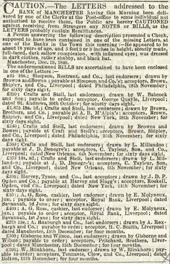 "The Morning Chronicle": 23 Dec. 1840, including Page 1, column 3 "Caution. - The letters addressed to the Bank of Manchester having this morning been delivered by one of the clerks at the Post Office to some individual not authorised to receive them, the Public are hereby cautioned against receiving from strangers any Notes or Bills, as the letters probably contained remittances..........", red 1d. Newspaper Tax handstamp, fine