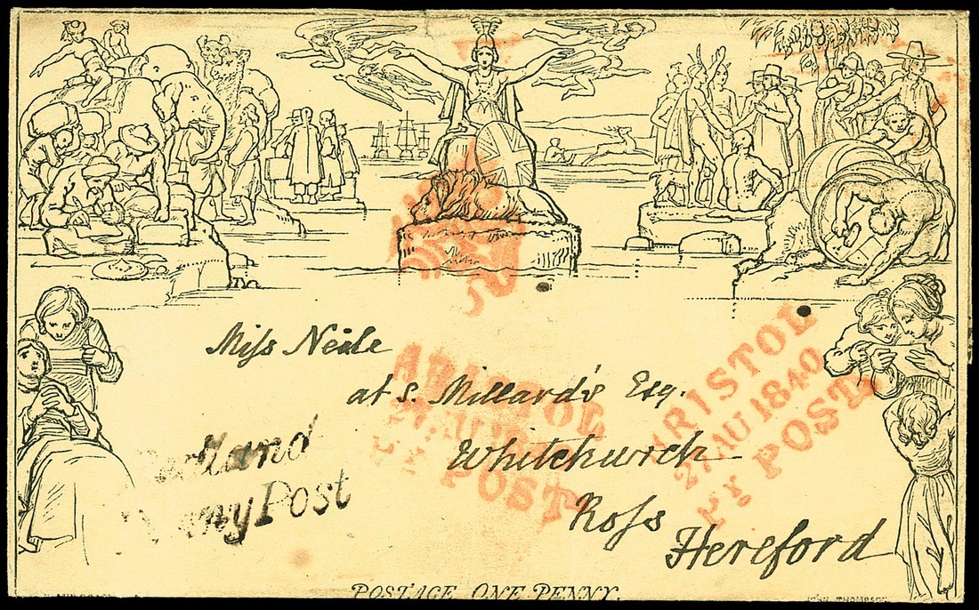 Stereo missing: Addressed to Hereford, with black "Redland/Penny Post" handstamp, red Maltese Cross cancellation and two strikes of "BRISTOL/27 AU 1840/Py POST" in the same colour; a few minor perimeter faults; fine. Photo