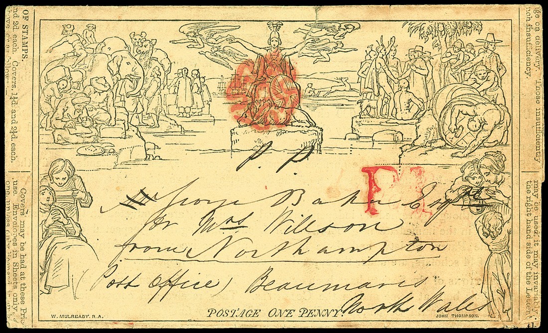 A232 (forme 6) with British and Foreign School Society advertisement with J. Rider, Printer, 14 Bartholomew Close at foot, MA415b), addressed to North Wales, dated 23 Oct. 1840, red Maltese Cross cancellation and red "P1" on the front; soiled and small faults but rare. Photo
