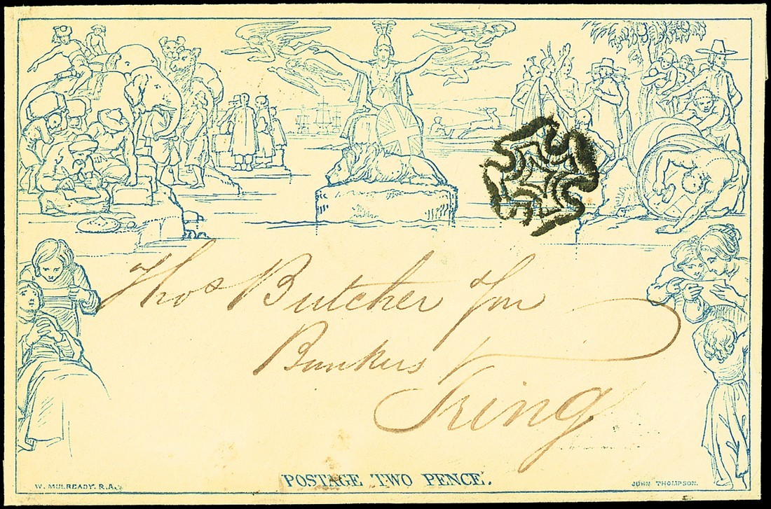 a202, another addressed to Thomas Butcher of Tring, with red wax "D&T" seal on the reverse, black Maltese Cross cancellation applied well to the right of Britannia, Lombard St. Maltese Cross d.s. (12 March 1842) and double ring Tring (12.3) arrival markings on the reverse; uncreased, very fine and fresh. A wonderful example. Photo