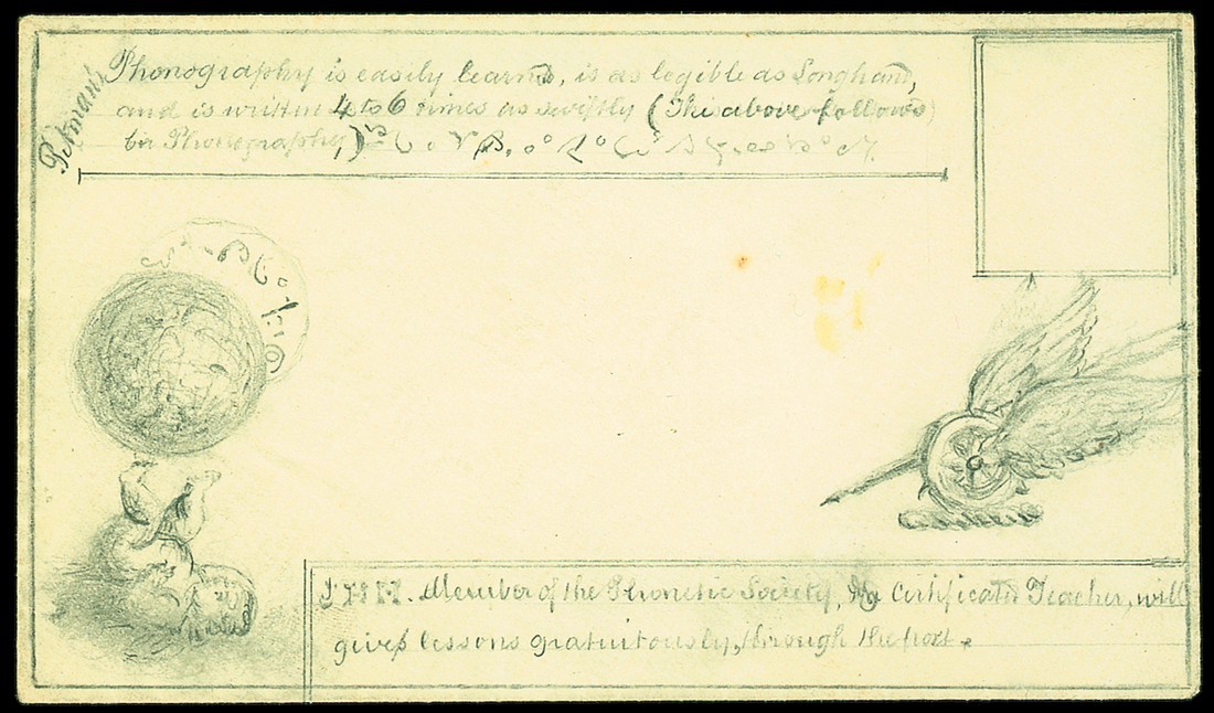 Pitman's phonography envelope, the original artwork in pencil on envelope with embossed seal "hewitt/wine merchant/lichfield" on reverse, inscribed "Pitmans Phonography is easily learned, is as legible as longhand, and is written 4 to 6 times as swiftly (the above follows in phonography)..... J.H.N. member of the phonetic society, my certified teacher, will give lessons gratuitously through the post", fine. Most attractive and an important new discovery. Photo