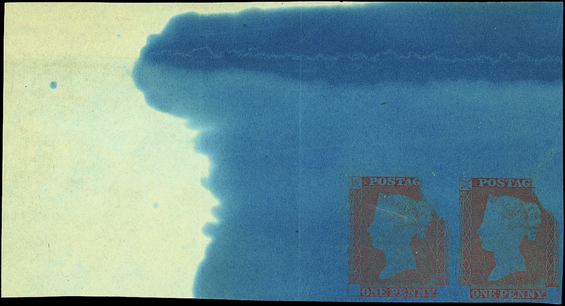 1d. state 3, in red-brown on wove paper dipped in prussiate of potash, [1-2] top left corner pair showing extremely large margins with a significant patch of white paper on the edge of the chemical dipping; some light creasing does not detract from this impressive piece. Specialised DP20a. Photo