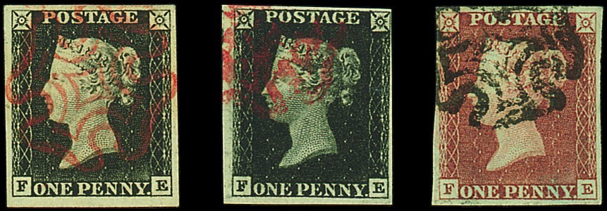 FE, matched with Plate 1b and 1d. red Plate 1b, close to large margins all round, the blacks with red Maltese Cross cancellations, the red cancelled in black, a fine trio. Photo