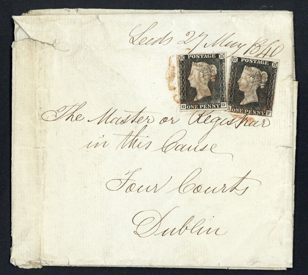 GG and SF, grey black shades showing moderate Plate wear, close to large margins all round, tied by red Maltese Cross cancellations on long entire, dated 27 May 1840, from Leeds to Dublin; the entire folded and with faults, the adhesives fine