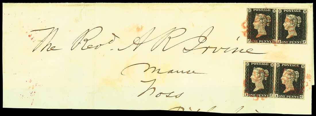 IF, IG (just joined at top) and JE-JF pair, in a deep shade, good to very large margins all round, tied by light strikes of a light, watery red Maltese Cross to part cover, dated 29 May 1840, the reverse with Glasgow despatch and Edinburgh c.d.s. The piece with folding creases but the adhesives are fine. An unusual May date cover. Photo