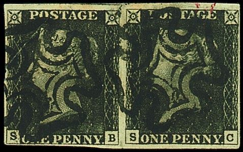 SB-SC horizontal pair, close to large margins all round and showing a trace of the adjoining stamp at upper left, black crisp Maltese Cross cancellations; SB with diagonal corner creases, otherwise fine. Photo