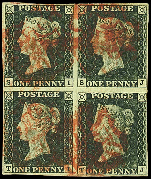 SI-TJ block of four, close to large margins all round, red Maltese Cross cancellations; diagonal crease affects three stamps, otherwise fine, an attractive and rare block from this Plate. Photo