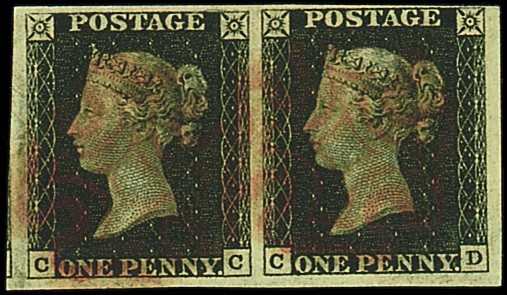 CC-CD (CD double letter D) horizontal pair, close to large margins all round and showing a portion of the adjoining stamp at lower left, light red Maltese Cross cancellations; fine. Photo
