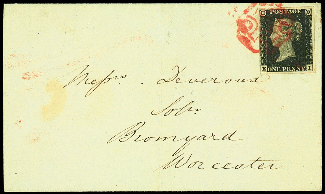 EI, good to large margins all round, tied by red Maltese Cross cancellation to entire (side panels missing), dated 10 Aug. 1840, addressed to Worcester, double ring York d.s. on reverse; filing fold clear of the adhesive, fine. Photo