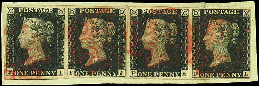 FI-FJ (FI double letter F) and FK-FL horizontal pairs, FL just touched at right, otherwise good to large margins all round, FI showing portion of the adjoining stamp at foot, on piece (to which they may not belong) with red Maltese Cross cancellations; fine. Photo
