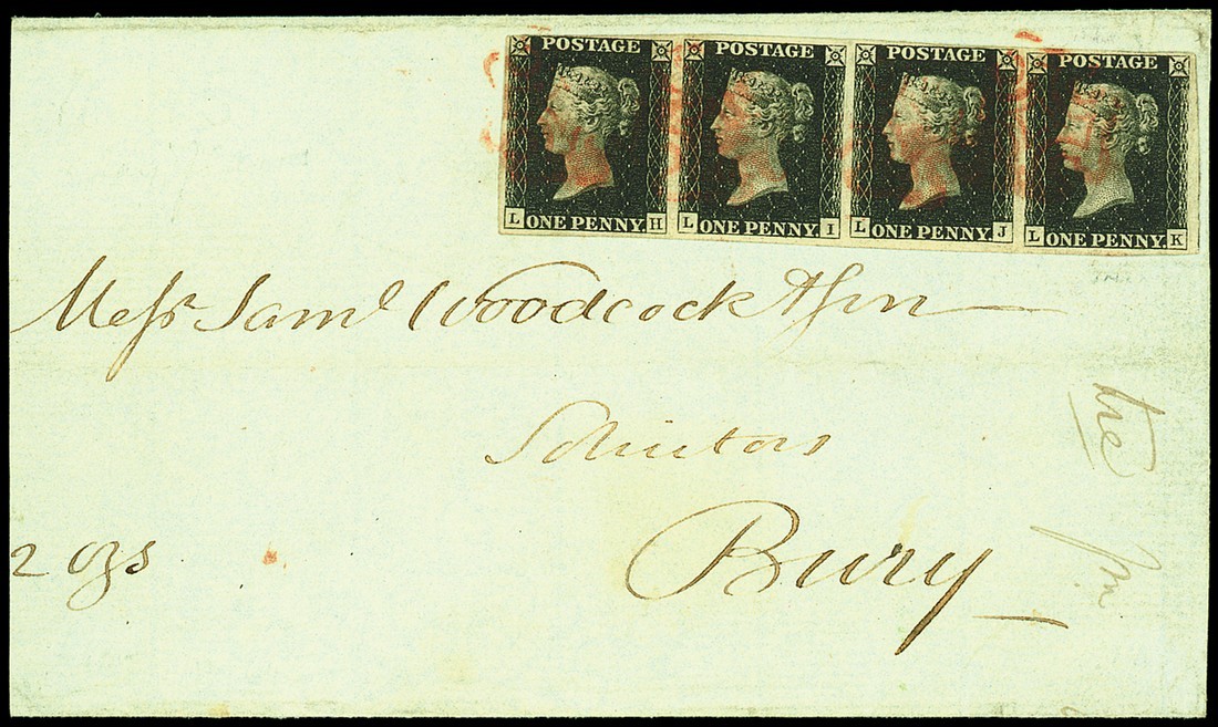 LH-LK horizontal strip of four, LH just touched at top left, good to large margins other sides and showing a trace of the adjoining stamp at right, tied by light red Maltese Cross cancellations (lifted and hinged to place) on entire (no side flaps), dated17 Nov. 1840, addressed to Bury, double ring Chester c.d.s. on reverse across flap, fine and attractive. Hunziker Certificate (1964). Photo