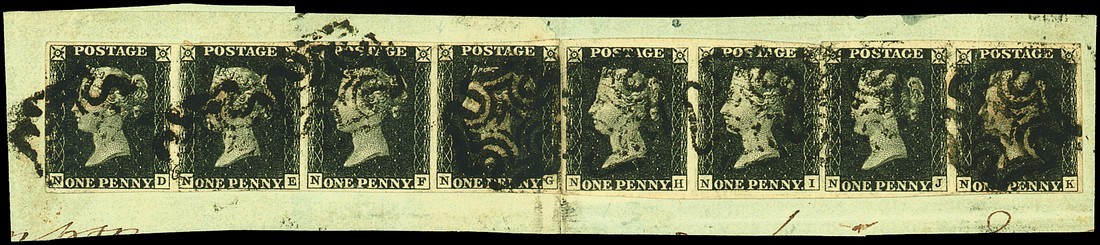 ND-NG, NH-NK (ND, NE, NF, NG, NI and NJ retouched check letters, NG also non-coincident re-entry) two horizontal strips of four, margins all round, tied by black Maltese Cross cancellations to piece dated 24 April 1841; wrinkle affecting NK, otherwise fine and an impressive and extremely rare piece. Photo