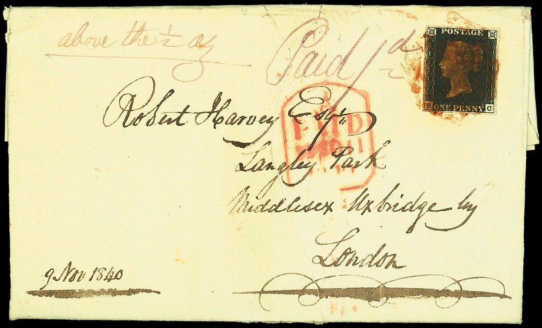 RC, good to large margins, heavily cancelled by red Maltese Cross cancellation, on entire letter, dated 9 Nov. 1840, from Douglas, Scotland to London, endorsed in red "above the ½oz" and "Paid 1d.", red Paid Tombstone d.s. on the front and framed red "douglas" on the reverse; the cover with a closed tear and filing folds, clear of the adhesive. A rare 1d. black cover with a manuscript weight endorsement. Photo