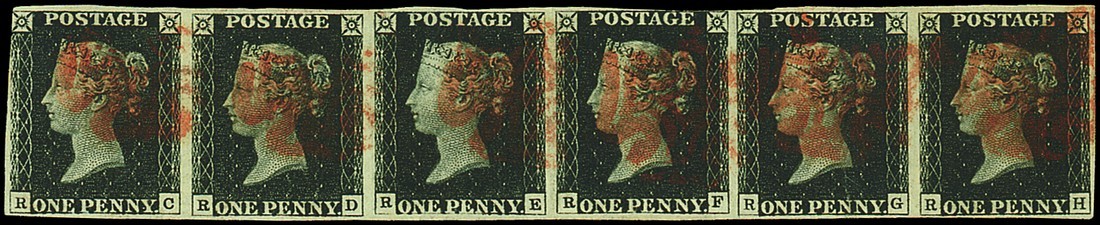 RC-RH (RD and RF recut side-lines, RE burr rubs) horizontal strip of six, RC touched at left, close to large margins other sides, red Maltese Cross cancellations, creases affecting RD and RG, fine and a rare multiple. Photo