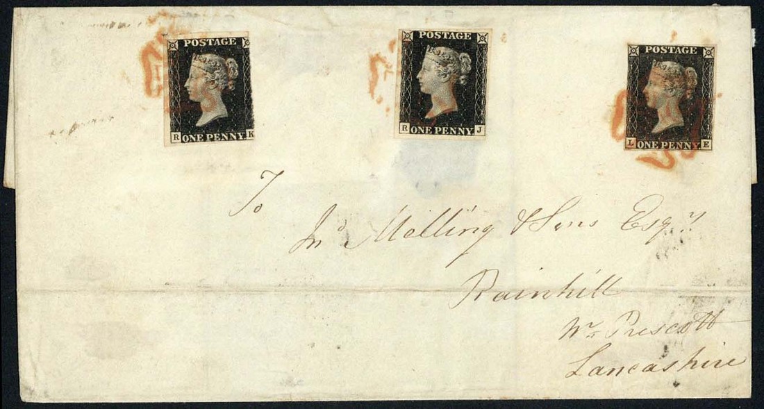 RK, RJ, used with Plate 6 LE on entire dated Oct. 1840, addressed to Lancashire; RK and LE touched or cut into at left, tied by red Maltese Cross cancellations, filing fold clear of the adhesives, a few faults but RJ fine