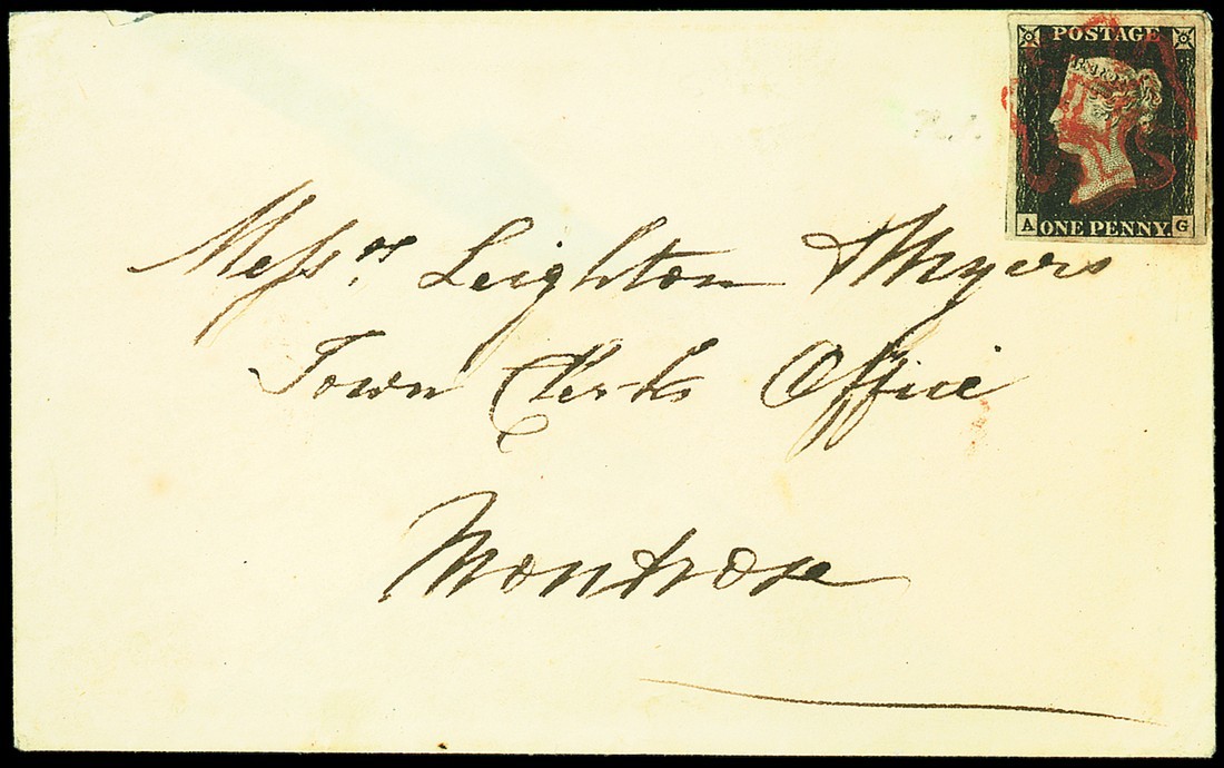AG, large margins and showing portions of adjoining stamps at left and right, tied by red Maltese Cross cancellation, in a reddish-orange shade, on envelope, dated 24 Sept. 1840, addressed to Montrose, on reverse red boxed Arbroath d.s., opening well for display; small portion of one of the flaps missing, otherwise fine and most attractive. Photo