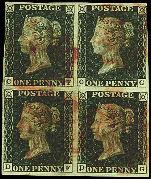 CF-DG (DG double letter G) block of four, CG close or just touched at upper right, good to large margins other sides, red Maltese Cross cancellations, fine. A rare block. Photo